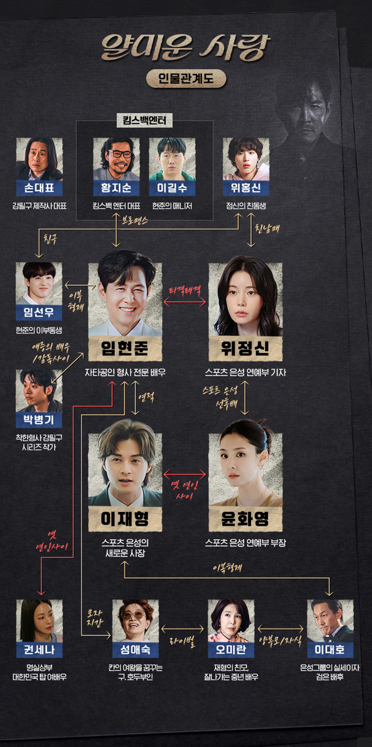 <얄미운 사랑> 인물관계도의 중심축은 임현준(이정재)과 위정신(임지연)입니다. 두 사람은 만나기만 하면 으르렁대는 '앙숙 관계'로 시작하죠.